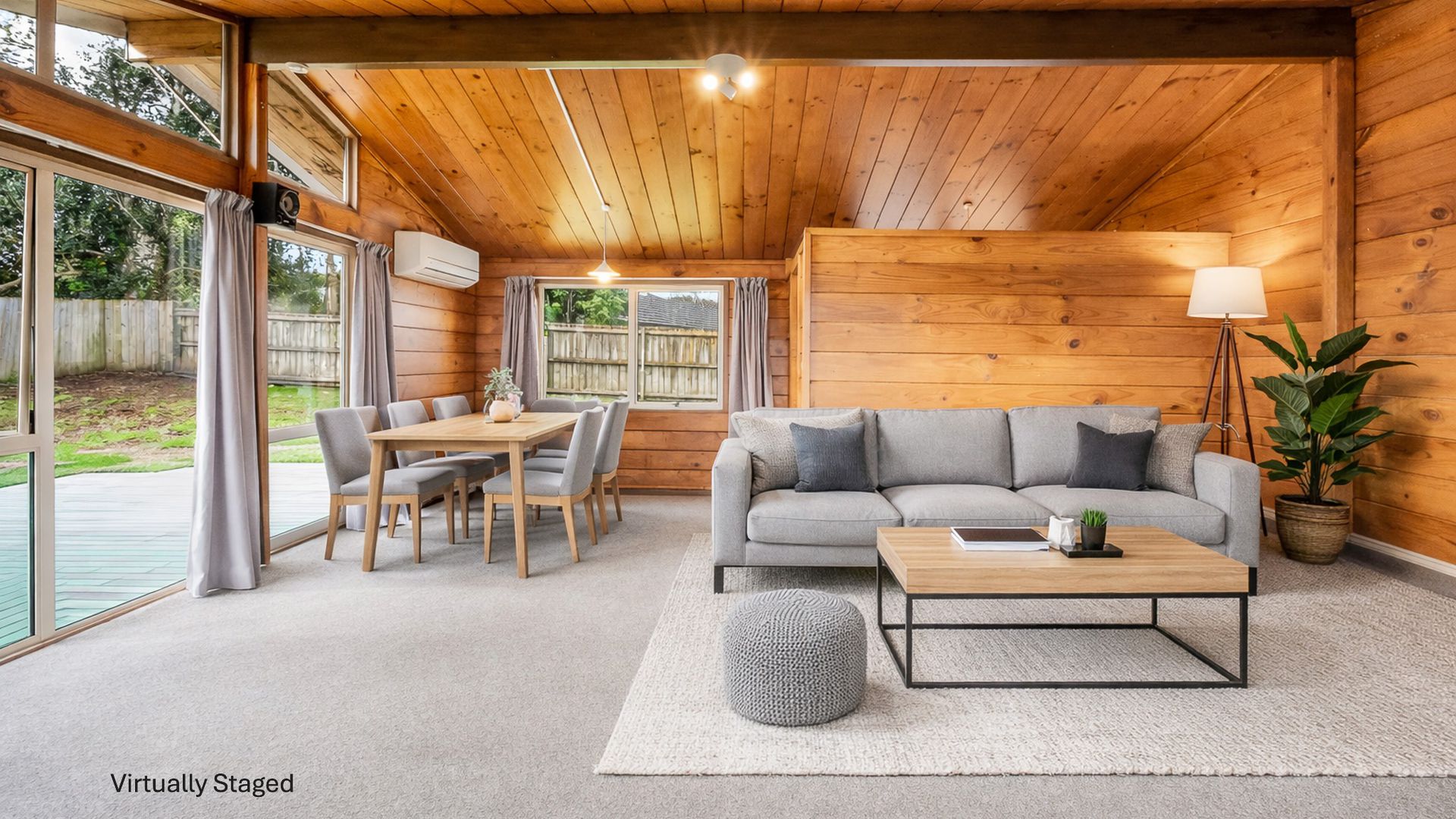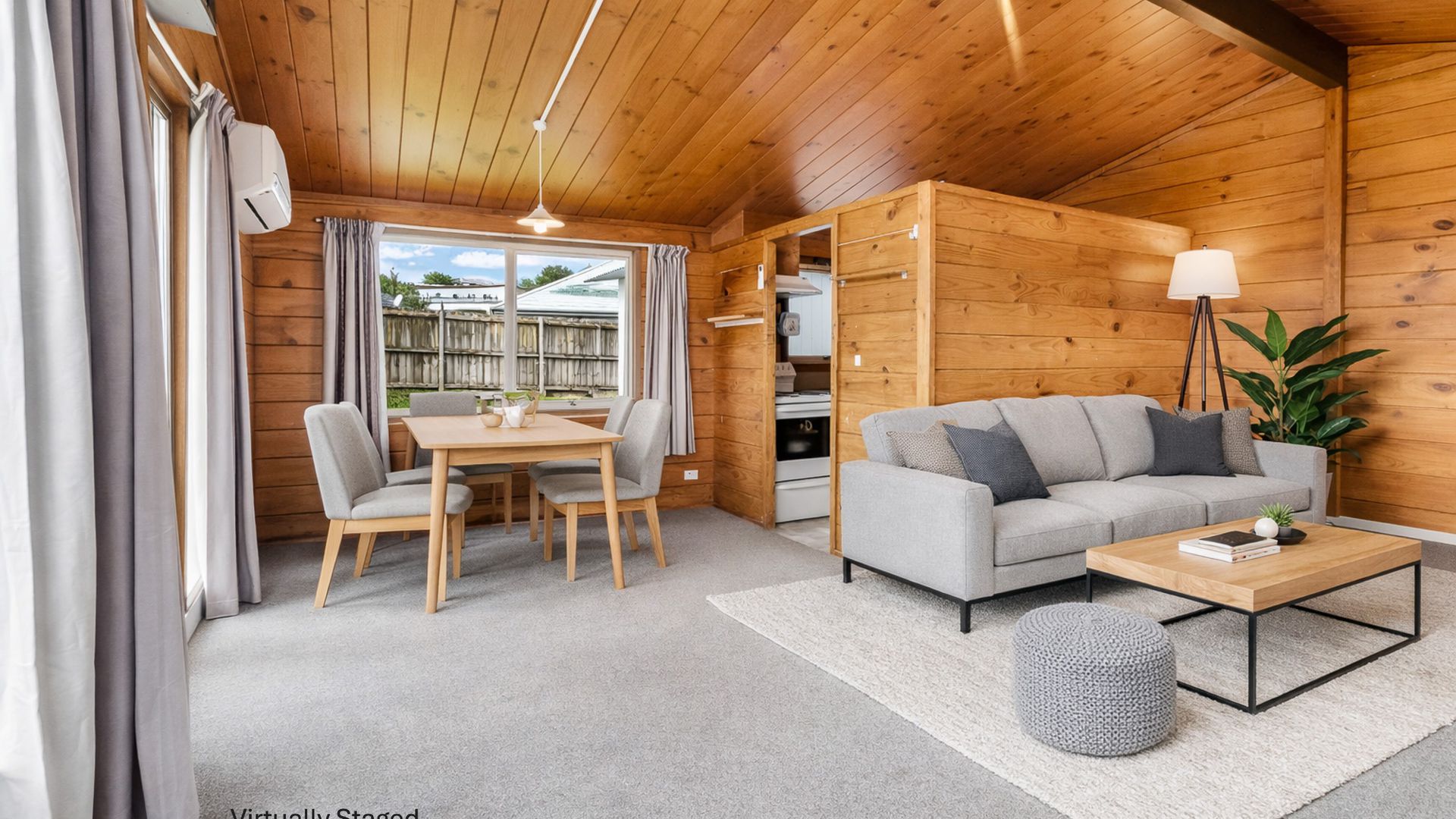 - Light filled living area with large windows that invite in all day sun